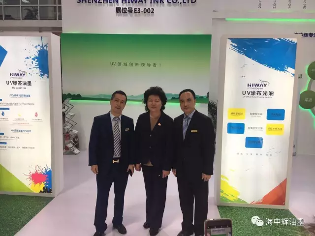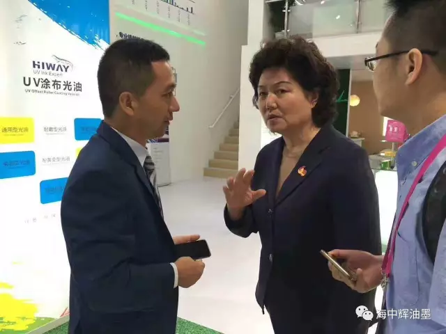 相隔四载,北京大印展王者归来,深圳市海中辉油墨制品有限公司也不容错过本次全球印刷盛宴,相继昨日开展以来,展会如火如荼,海中辉油墨(E3-002)迎接了来自全球各地、五湖四海的印刷界朋友。今日,国家新闻出版印刷发行司司长王岩镔和中国印刷技术协会领导一行光临海中辉UV油墨指导工作,海中辉董事长易建辉先生对她们的到来表示热烈地欢迎,亦表示海中辉将不遗余力推动中国印刷环保事业的发展!